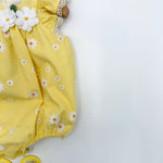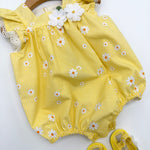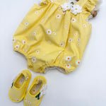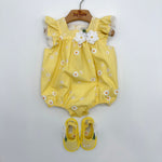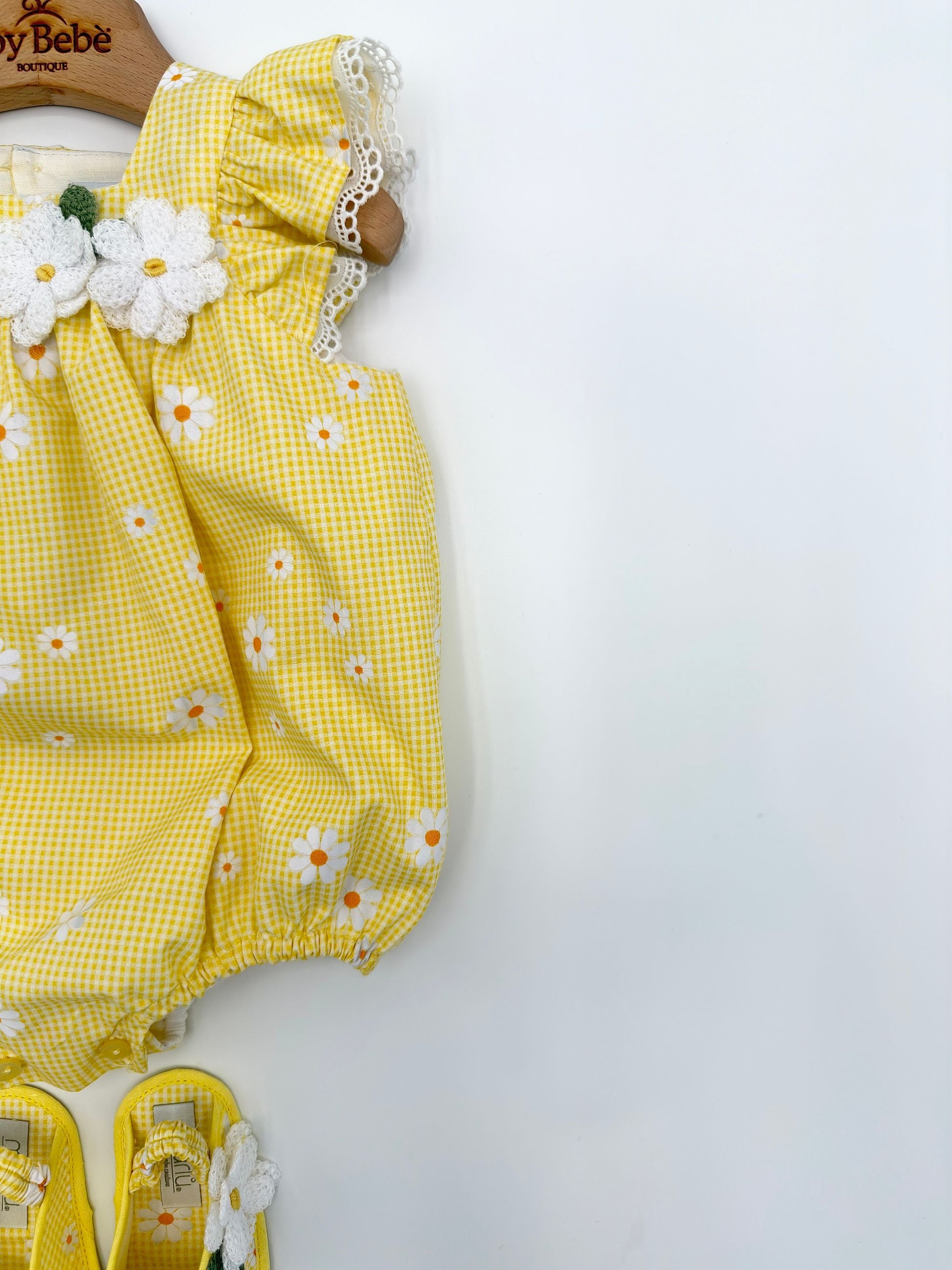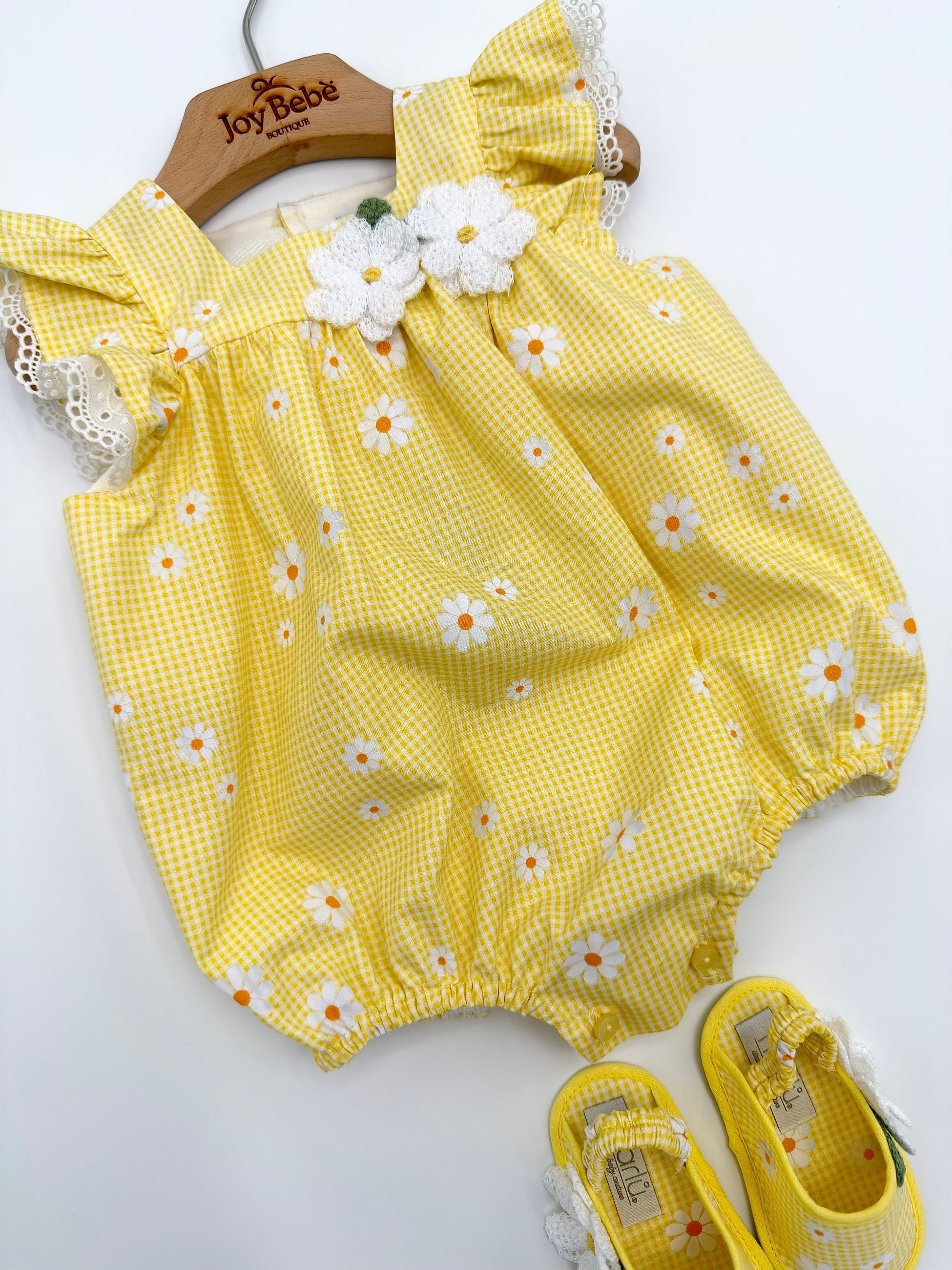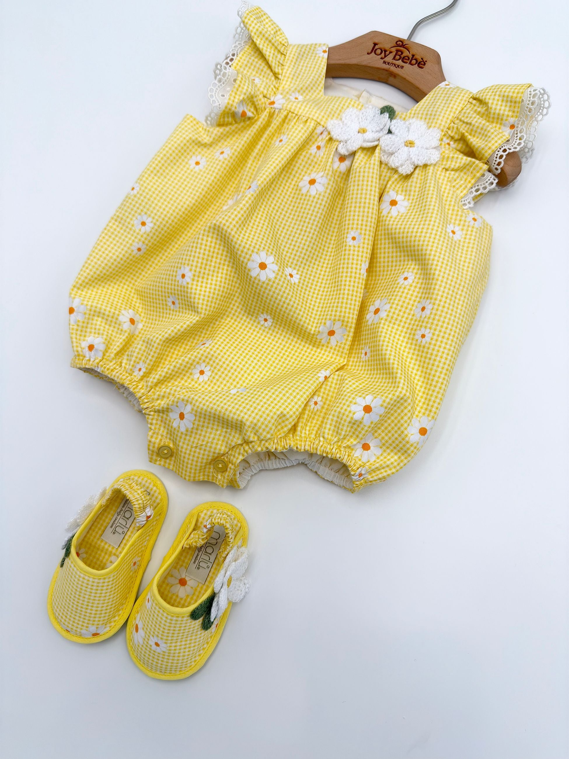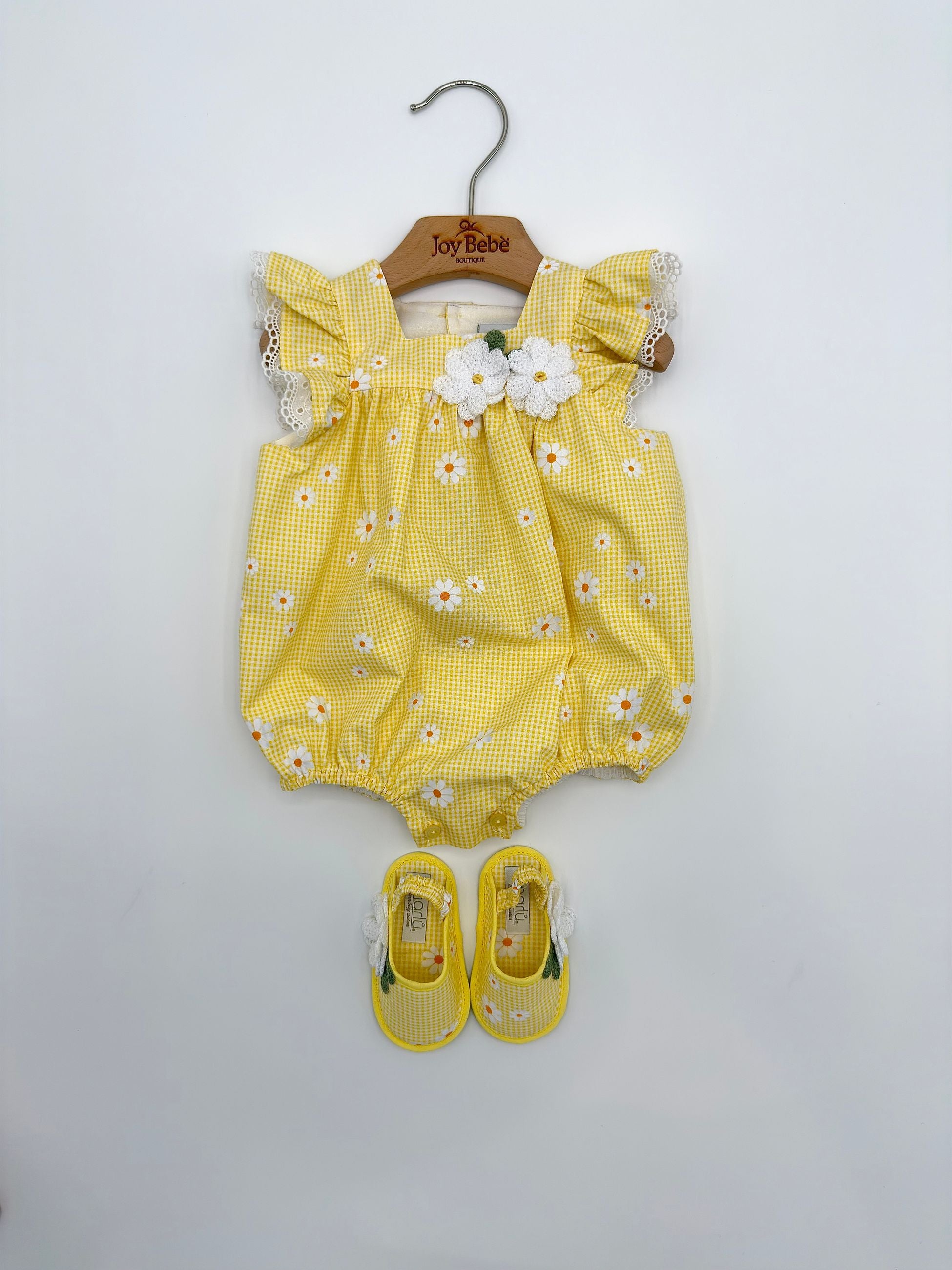 Le scarpine abbinate, nello stesso stile e tessuto del pagliaccetto, completano l’outfit con armonia e dolcezza, creando un coordinato raffinato e ideale anche per le foto ricordo