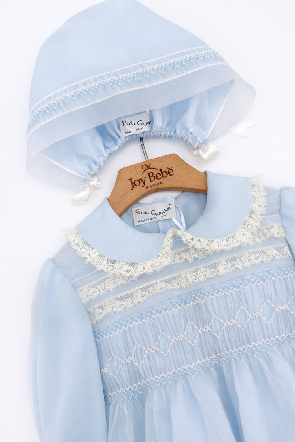 PICCOLA GIUGGIOLA nasce dalla passione per l’artigianato tradizionale e dalla cura per i dettagli che da sempre contraddistinguono il Made in Italy. Specializzata nella creazione di capi e accessori per il neonato, realizza ogni prodotto interamente a mano, combinando abilità sartoriale e un’estetica raffinata.