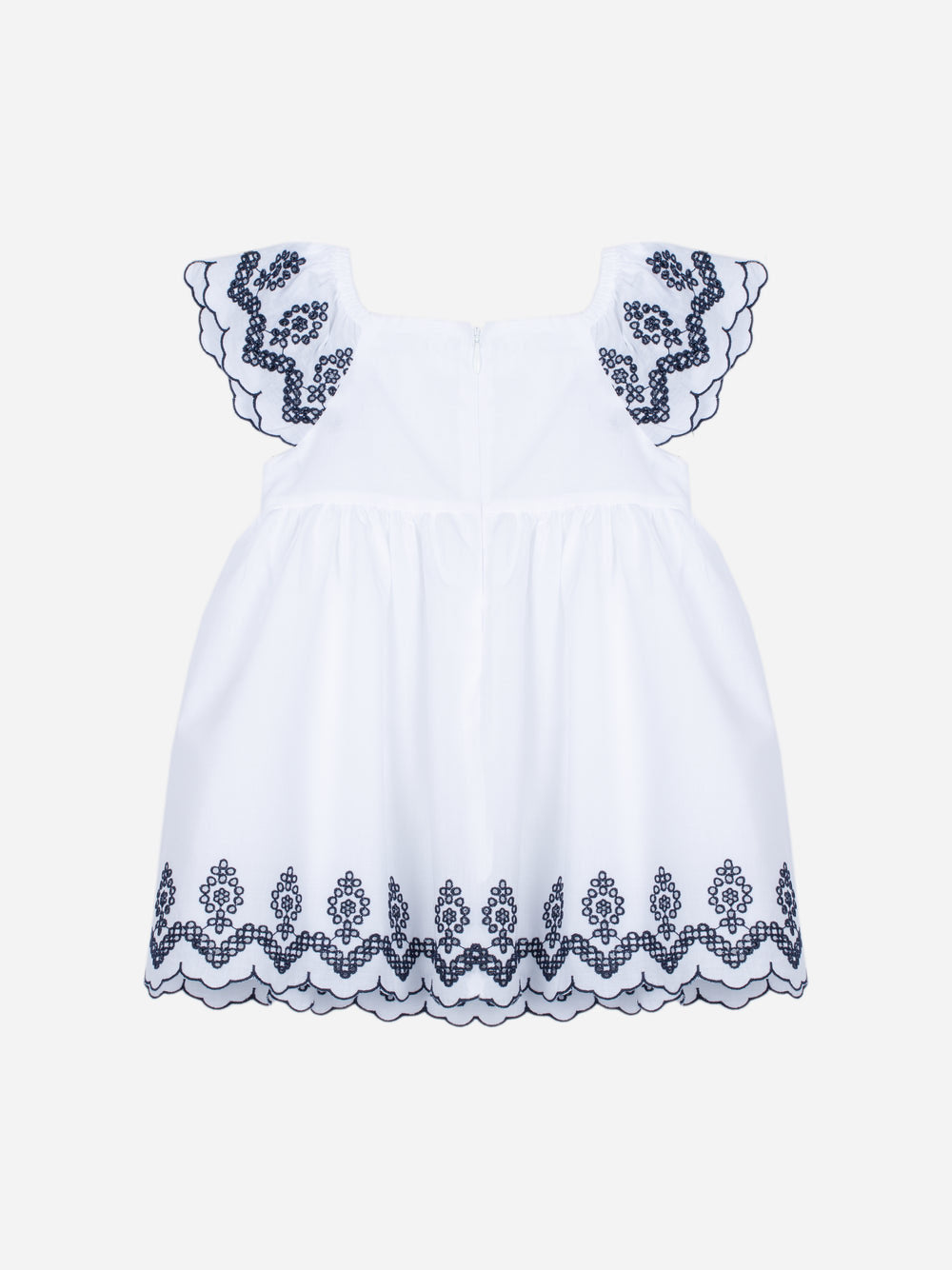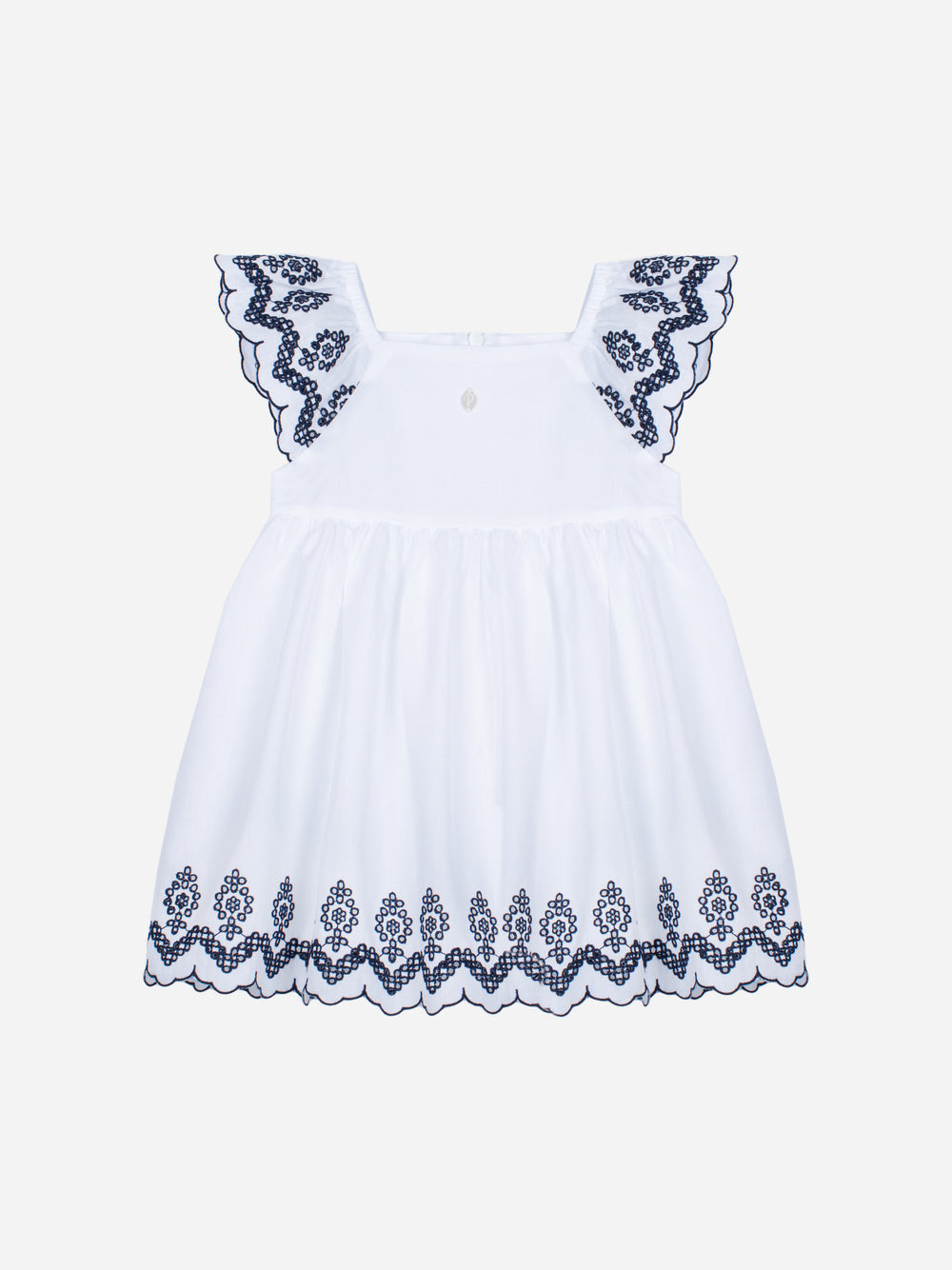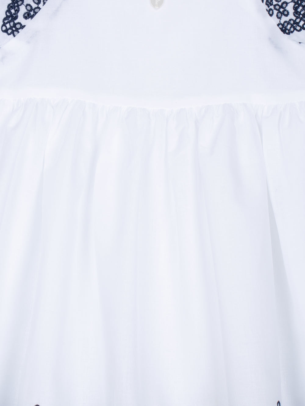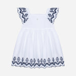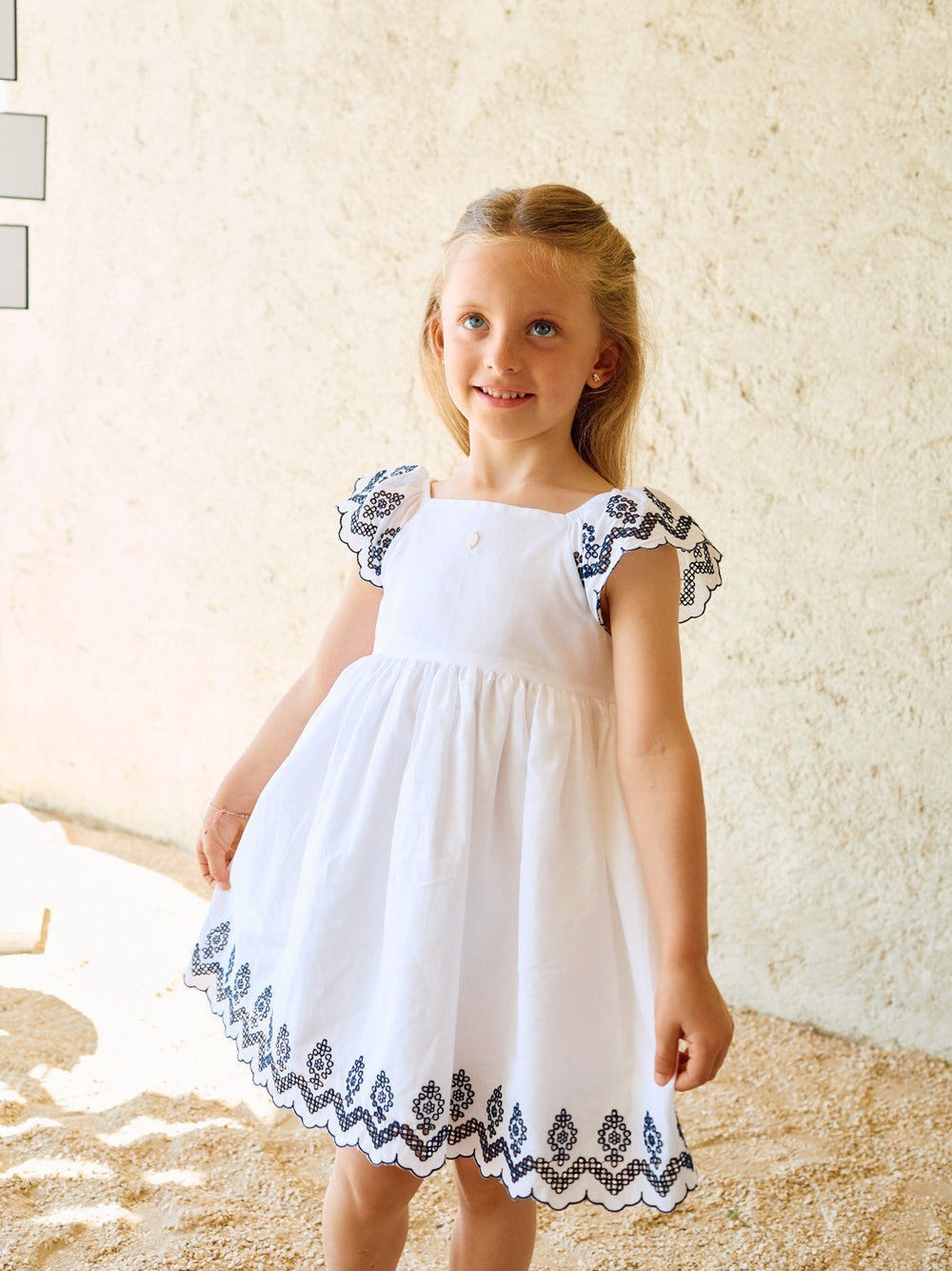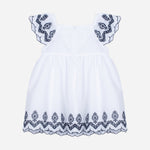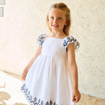 Questo vestito multicolore con stampa Flores è realizzato al 100% cotone, offrendo comfort e leggerezza. Presenta maniche corte e un delicato colletto con volant che aggiunge fascino al capo. Perfetto per occasioni speciali e per l'abbigliamento quotidiano delle ragazze.